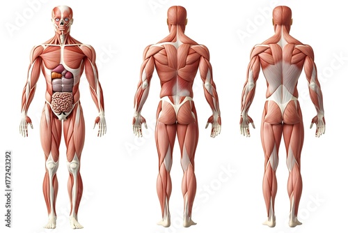 clean educational infographic of human body musculature and organ placement, isolated on white