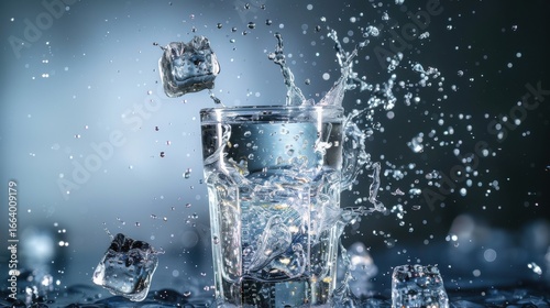 Clean Glass Cup with Ice Cubes: Refreshing Cold Water on Dark Background