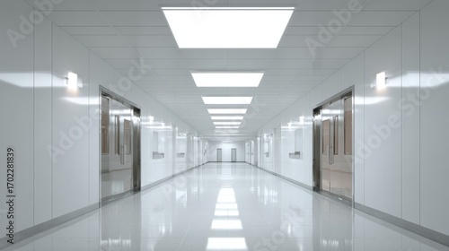 Clean Hospital Corridor with Sterile White Walls and Bright Lighting for Medical or Healthcare Concepts