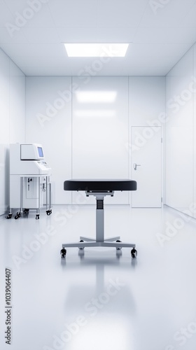 Clean laboratory room with equipment and a stool in minimalist white design.