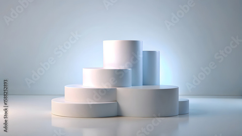 Clean minimalist white cylindrical pedestal stage with soft blue gradient lighting for product display
