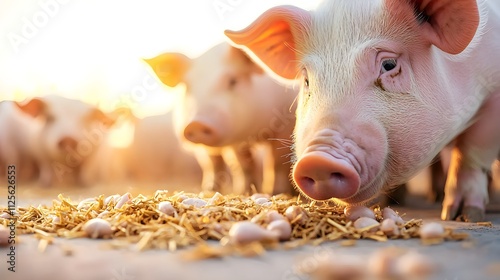 Clean, organized pig barn, healthy pigs feeding from a trough, focus on farm hygiene, straw-covered ground, gentle natural lighting--style raw