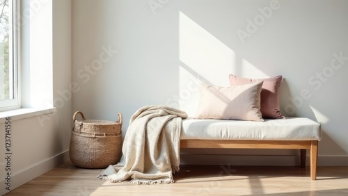 Clean pillows, a blanket and a storage bench on the floor near a white wall. Bright lighting in a modern room
