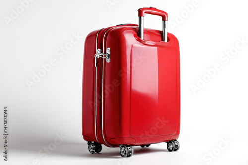 Clean red suitcase with extended handle, on white