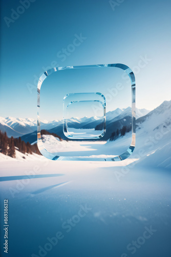 clean shapes, crystal transparent cube through which snowy mountains are visible, advertising, product presentation