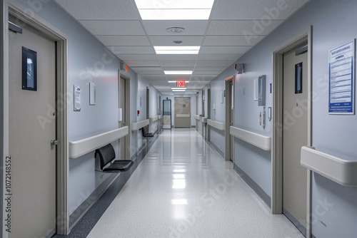 Clean sterile clinic corridor with bright overhead lights, emergency exit signs, and minimal decor.