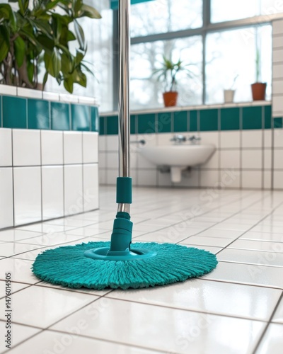 Clean tiled bathroom floor with a turquoise mop