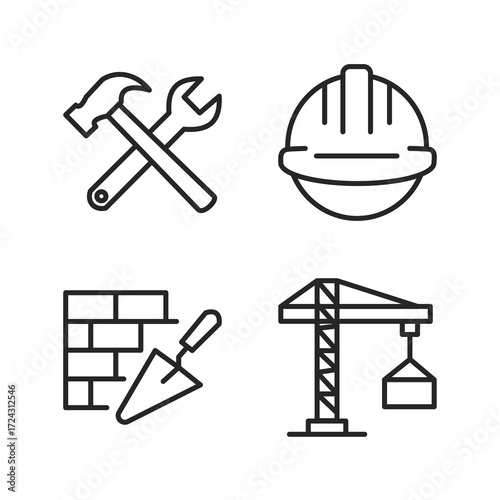 Clean vector line icons representing construction tools, safety gear, and building operations. Perfect for professional use in industrial design and UI