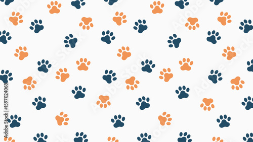 Clean white background with a playful pattern of navy blue and orange paw prints. Cheerful, seamless vector for pet-related designs