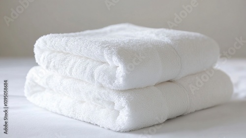 Clean white bath towels on the neatly clean bed of hotel room, coziness and clean concept. Generative ai