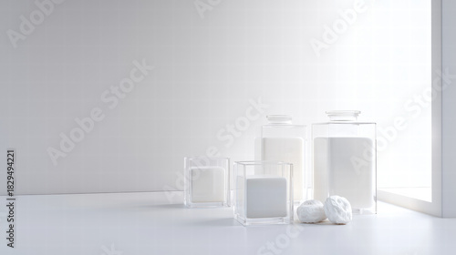 Clean white cosmetic jars and containers arranged on minimalist shelf with soft natural light and serene mood