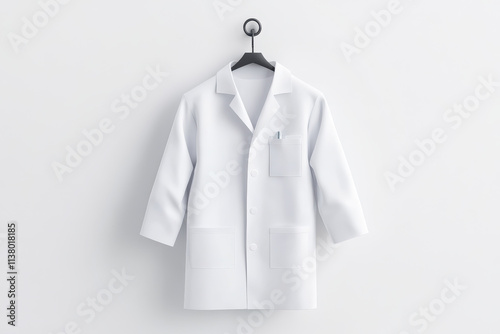 Clean white lab coat hanging on a hook against a white wall for scientific use.