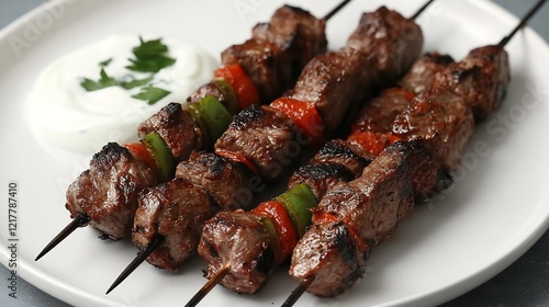 Clean white plate featuring lamb kebab skewers arranged with a side of yogurt sauce