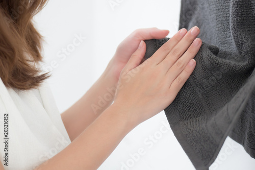 clean woman hand wash; hand portrait of asian woman washing her hand and wiping dry with towel; concept of hygiene, hygienic hand wash, body skin care, health care; asian young adult woman model