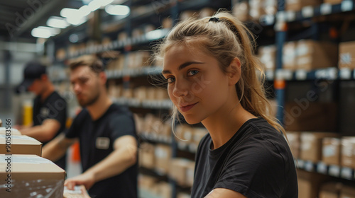 Clean workspace with a salesperson packing products, and the logistics team preparing shipments in an organized warehouse.