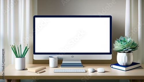 Clean workspace with computer, keyboard, and plants. Minimalist home office aesthetic.
