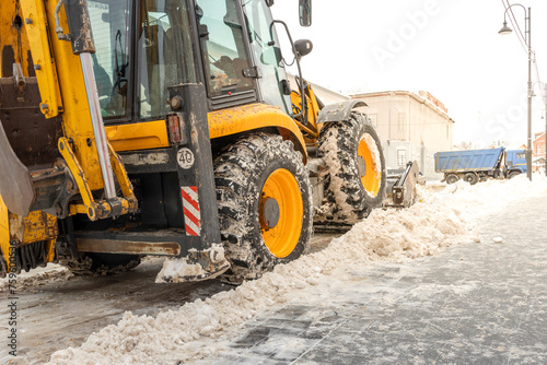 Cleaning city streets, a tractor-loader loads dirty snow into a dump truck. removal of snow and ice after heavy snowfalls and blizzards. Outdoor snow blower, sidewalk and driveway cleaning.