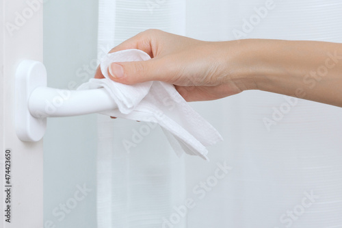 Cleaning door handles with an antiseptic wet wipe and gloves. Sanitize surfaces prevention in hospital and public spaces against corona virus. Woman hand using towel for cleaning home room door link