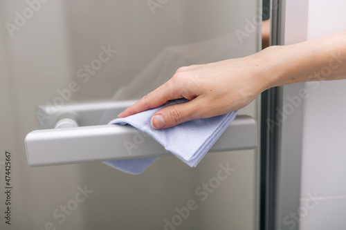 Cleaning glass door handles with an antiseptic wet wipe. Sanitize surfaces prevention in hospital and public spaces against corona virus. Woman hand using towel for cleaning home room door link