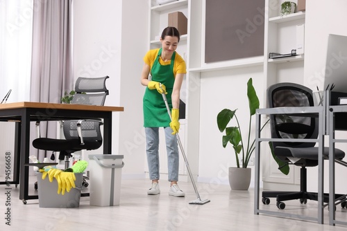 Cleaning service worker washing floor with mop. Bucket with supplies in office
