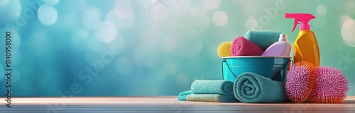Cleaning supplies arranged in a colorful bucket on a wooden surface