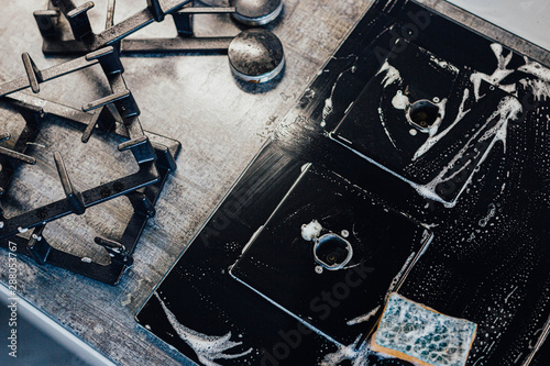 cleaning the kitchen, cleaning a modern gas stove with a sponge and foam.
