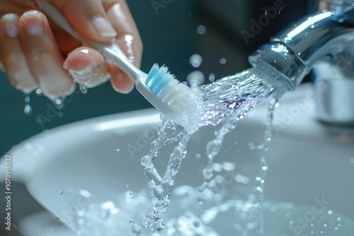 Cleaning Toothbrush. Daily Hygiene Routine for a Clean and Laundered Brush in Sink