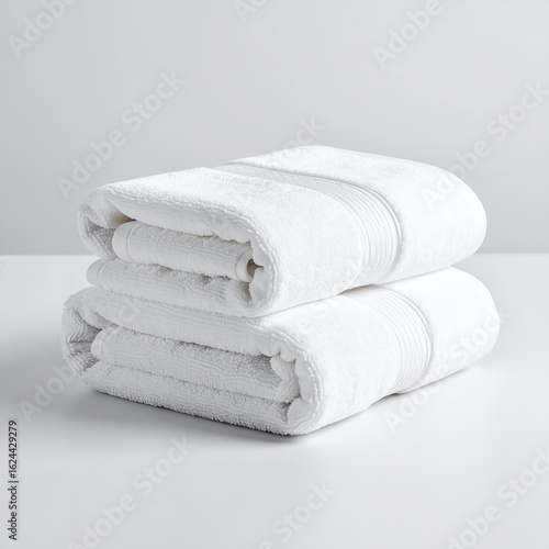 Cleanliness: Neatly stacked white bath towels in a minimalist setup on white background