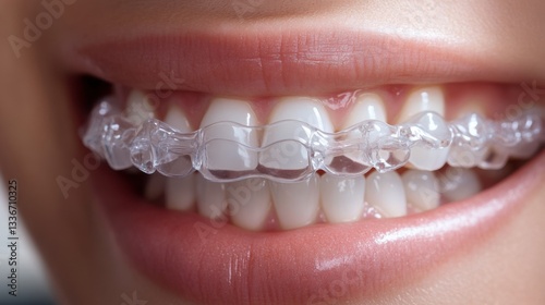 Clear aligners adjust teeth alignment for a confident smile in a close-up dental setting