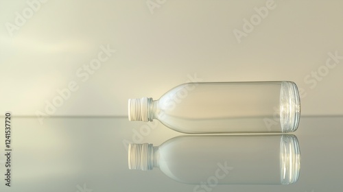 clear biodegradable plastic bottle, resting horizontally, on a reflective glass table