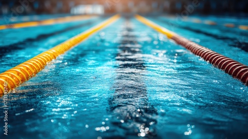 Clear blue water fills swimming lanes in an outdoor pool, with sunlight reflecting off the surface and lane dividers visible