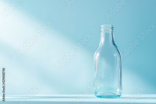 Clear glass bottle mockup with a droplet on a soft pastel blue background.