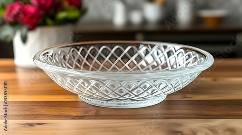 Clear Glass Bowl with Diamond Pattern on Wooden Table