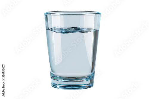 Clear glass filled with water sits on a plain background showcasing its contents and reflections from different angles