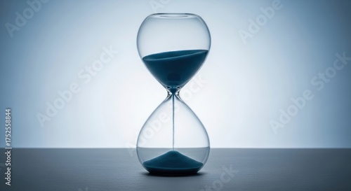 Clear glass hourglass with blue sand flowing, symbolizing time passing and urgency