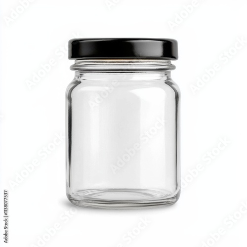 Clear glass jar with black lid on solid white background for storage ideas and organization tips