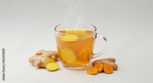 Clear Glass Mug Steaming Ginger Turmeric Tea with Fresh Roots on White Background Displaying Herbal Infusion