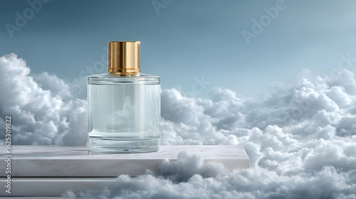 Clear Glass Perfume Bottle with Gold Cap on Marble Surface Above Clouds