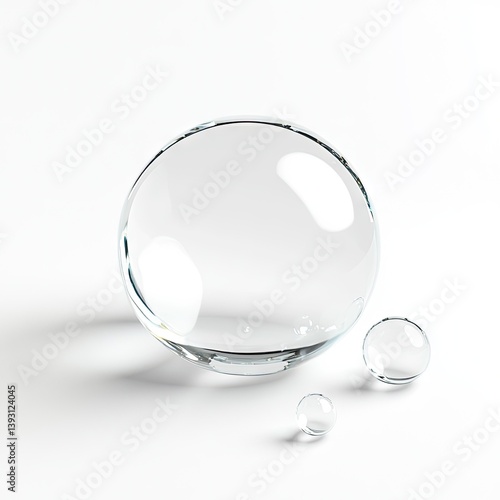 Clear glass sphere and smaller spheres on a white background