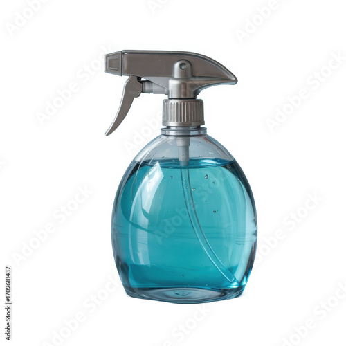 Clear glass spray bottle filled with bright blue liquid and silver trigger sprayer isolated on transparent background