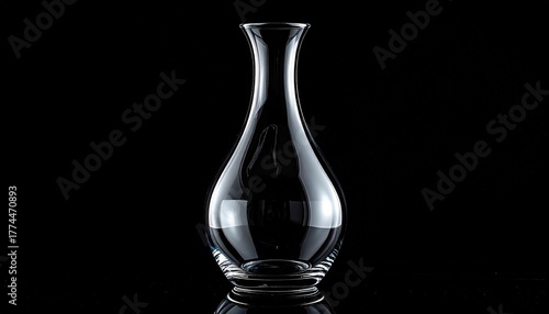 Clear glass vase with bulbous base and narrow neck, flared top, smooth reflective surface, elegant contours, set against black background.