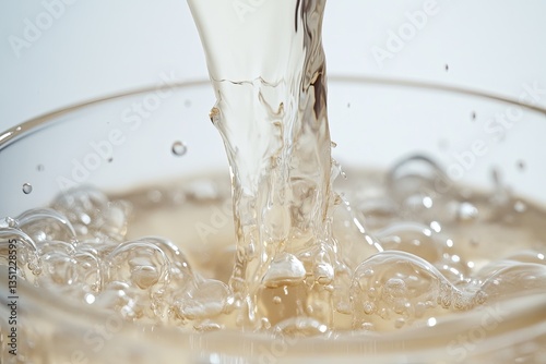 Clear liquid pouring into glass bowl, close-up, bubbles forming