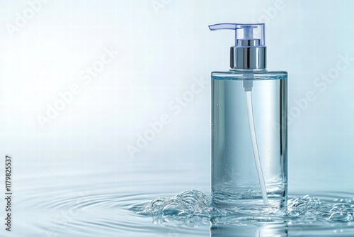 Clear Liquid Soap Dispenser on Blue Background with Water Ripples