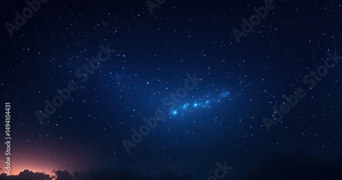Clear night sky filled with numerous bright stars and a faint glowing nebula above a dark horizon with soft clouds and distant light