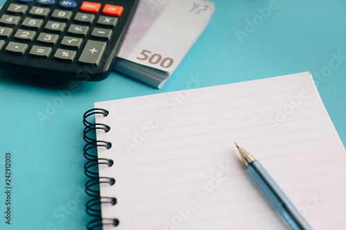 clear notebook, pen, pack of Euro banknotes and a calculator on a blue background