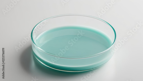 clear petri dish filled with light teal liquid on smooth surface. liquid color contrasts with transparent glass