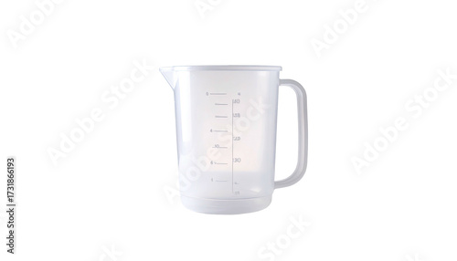 Clear plastic measuring jug with handle and volume markings on a dark background