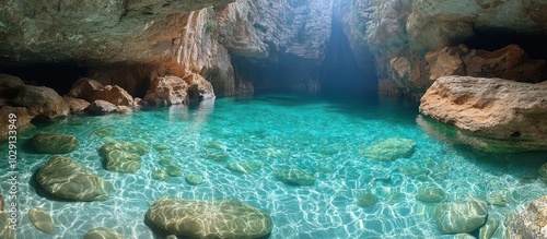 Clear turquoise water in a cave, sunlight shining through the opening.