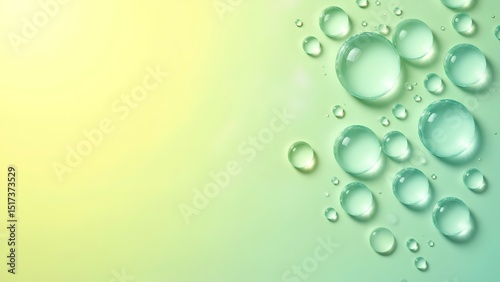 Clear water droplets on a smooth, gradient background with light green and yellow hues.