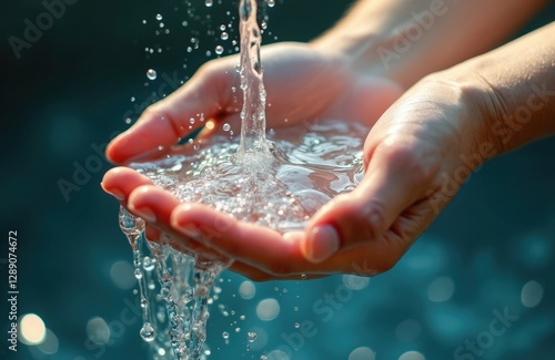 Clear water flows through cupped hands, symbol of purity, freshness. Droplets of water glisten in light. Natural source of vitality, hydration and care. Essence of aqua.